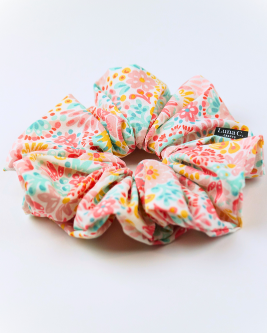 Pink with multi-colour Floral pattern Japanese Style Oversized Scrunchie