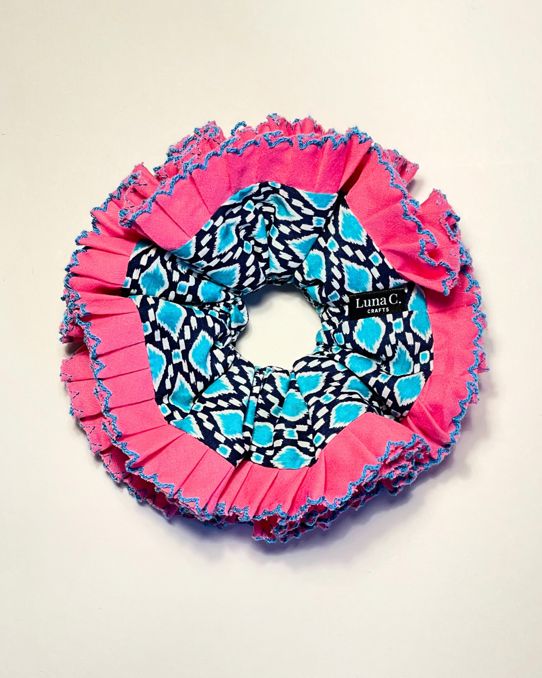 FLOWER by Luna C. Summer Bloom Aqua Blue Abstract Hot Pink Double-Layer Ruffle Scrunchie