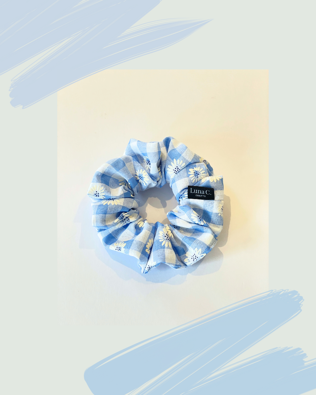 Light Blue and White Gingham with Daisy Florals Regular-size Scrunchie