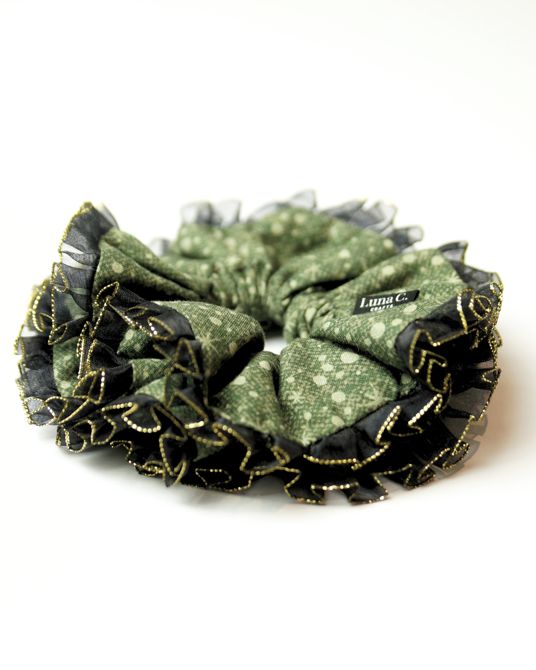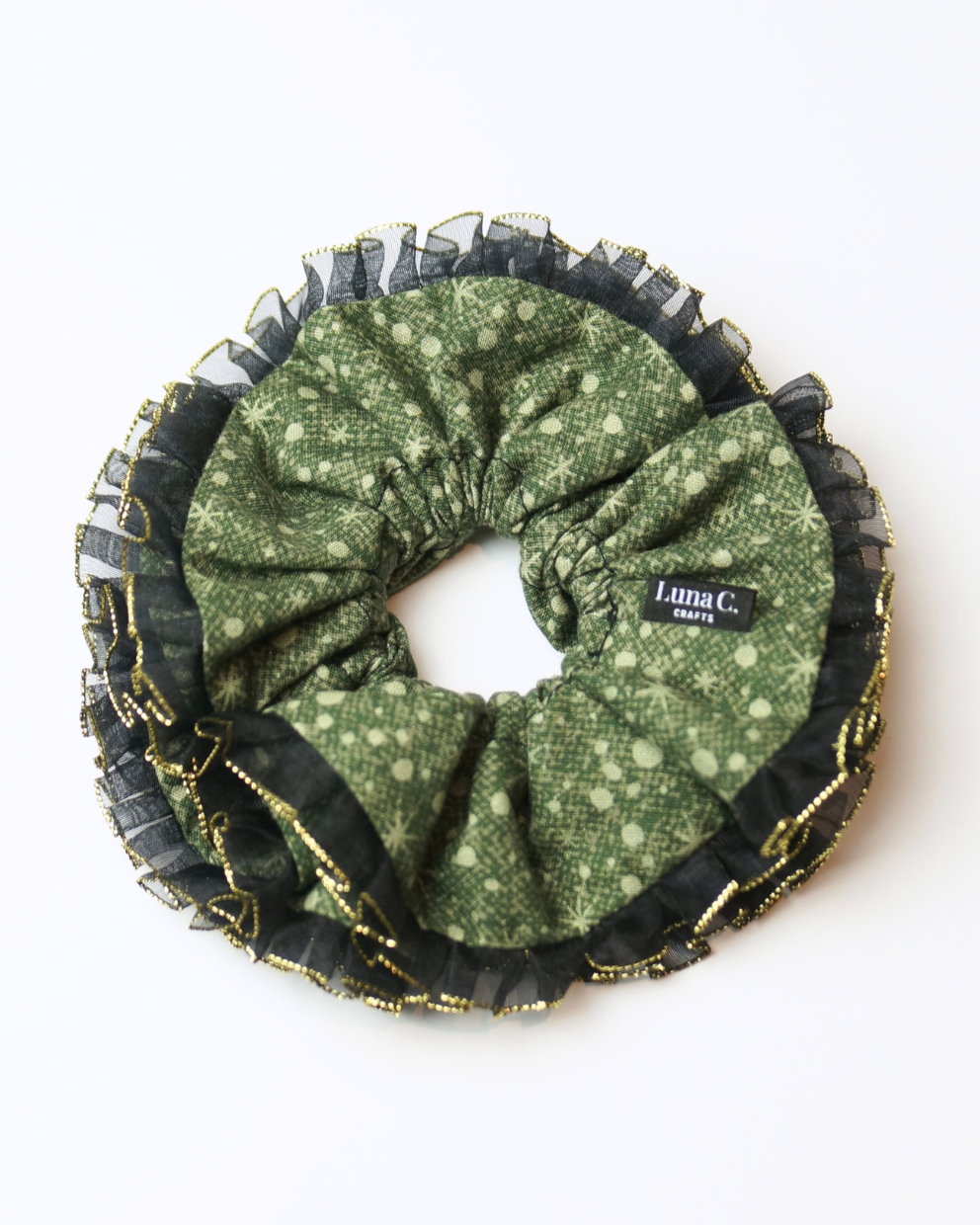 FLOWER by Luna C. Scrunchie in Mosaic Green with Black and Gold Double Ruffle