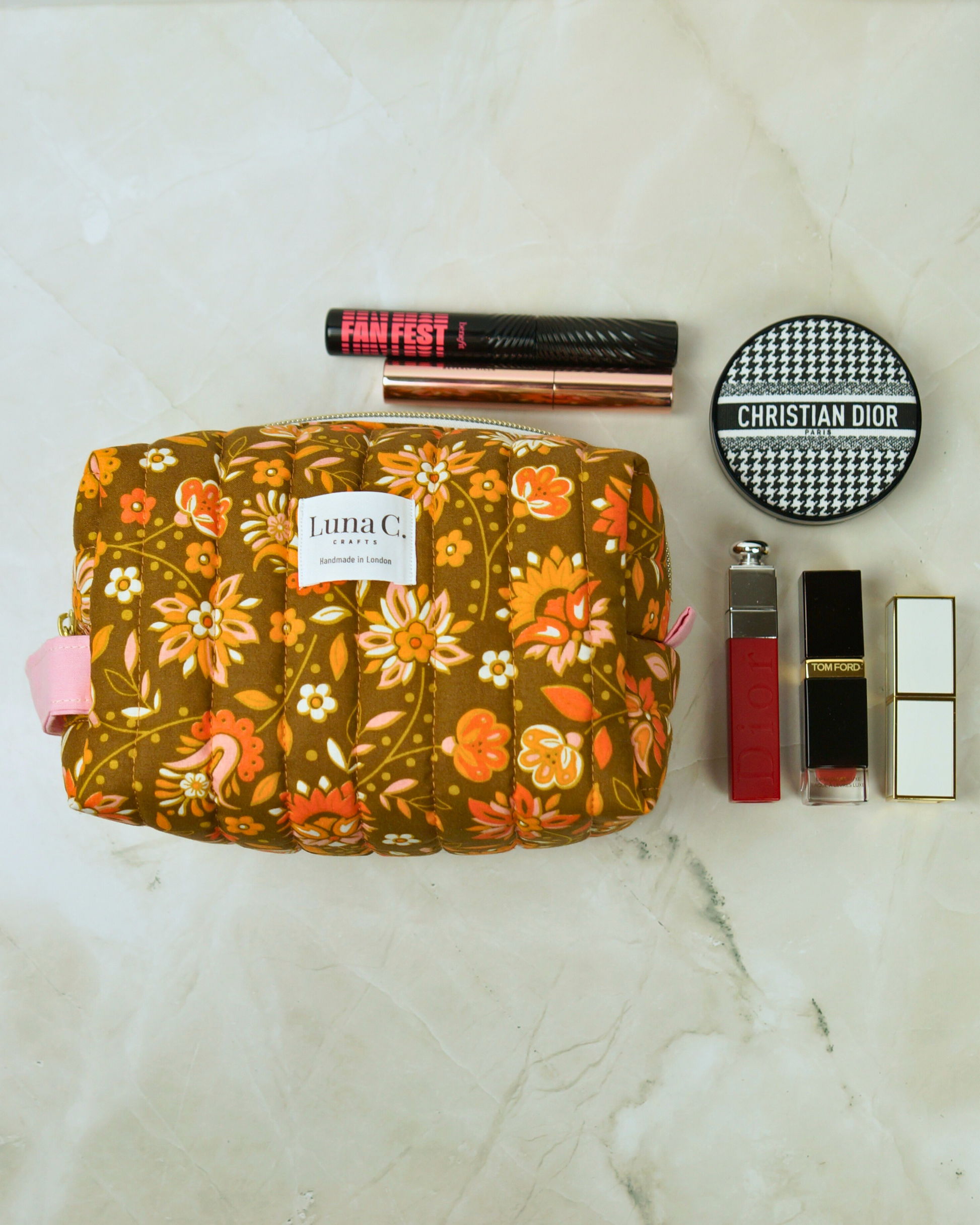 Peach Orange Floral Quilted Makeup Bag - Large Size