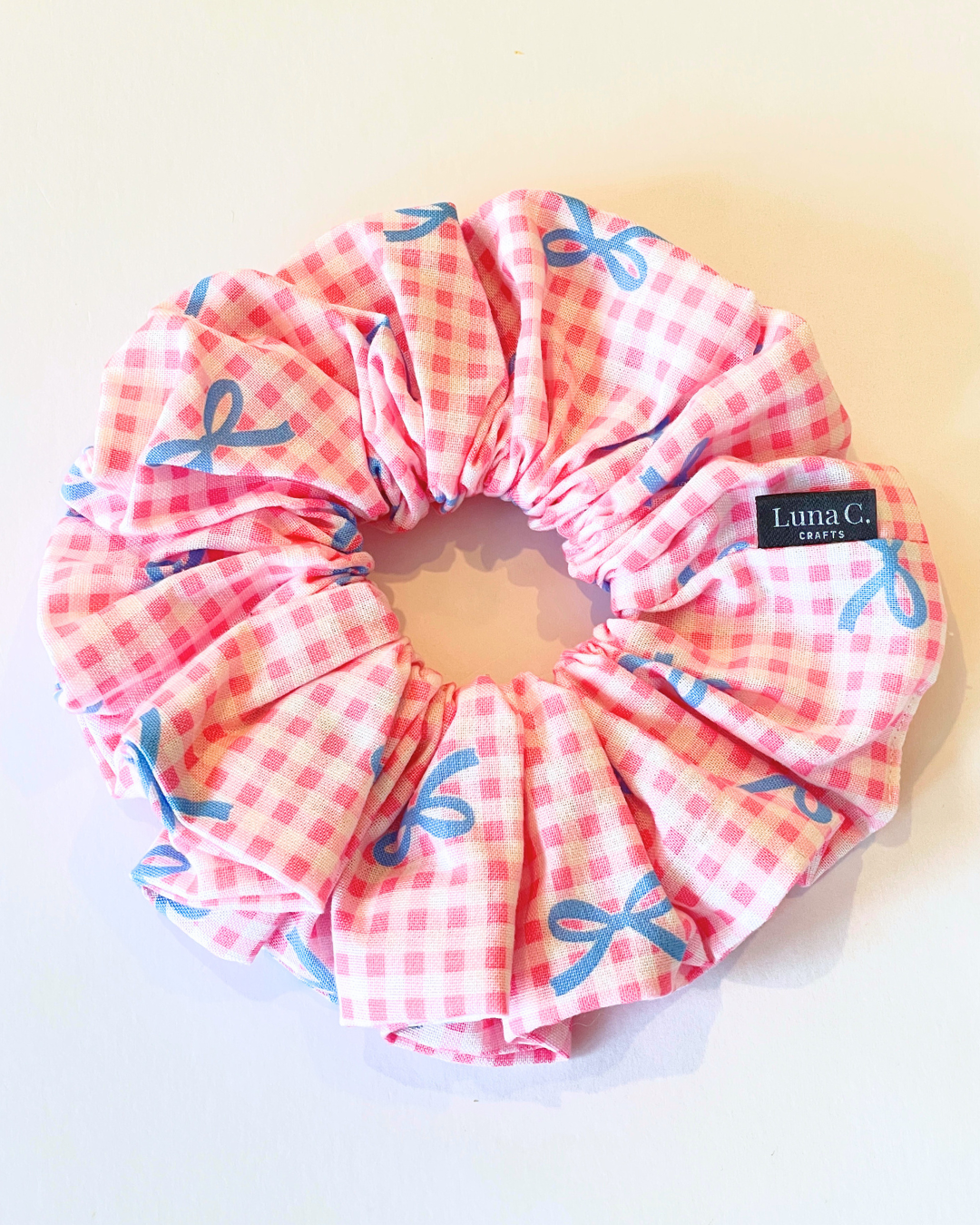 Pink and White Gingham with Blue Bow Accents Oversized Scrunchie